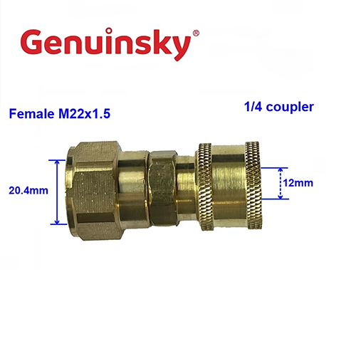1/4 -дюймовый муфт - это небольшой разъем, используемый для подключения труб, кабелей или интерфейсов оборудования. Внутренняя нить состоит из спецификации M22 × 1,5, двойного нажатия латунного быстрого разъема, 20 SFA, 1/4 дюйма, для надежного соединения. Продукт изготовлен из латуни. Преимущество латунного материала - коррозионная стойкость, которая может адаптироваться к сложным сценариям использования и продлить время использования продукта.