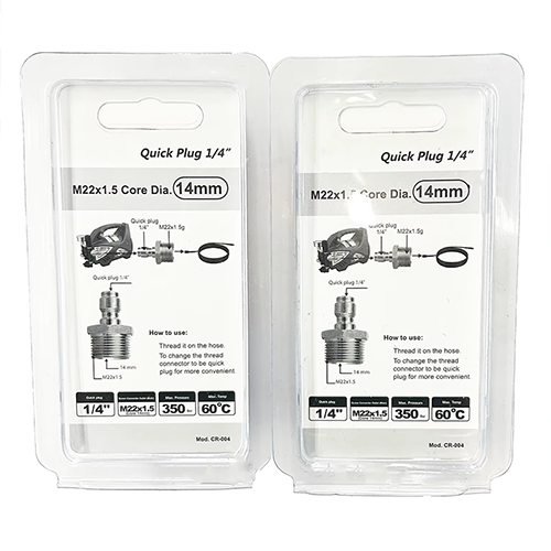 При очистке под высоким давлением очень важно стабильное соединение оборудования. Размер этой быстросъемной заглушки M22x1,5 1/4 дюйма очень точен. Один конец представляет собой заглушку 1/4 диаметром 11,7 мм. Конструкция быстрого подключения обеспечивает более удобное подключение и разборку. Для профессионалов это может повысить эффективность работы. Для обычных индивидуальных пользователей это также может упростить использование процесса без сложных инструментов для установки. Другой конец — «папа» M22×1,5 диаметром 22 мм. В то же время можно выбрать две апертуры: диаметр сердечника 14 мм и диаметр сердечника 14 мм. Стандартные характеристики резьбы M22×1,5 можно использовать с различным чистящим оборудованием. Нет необходимости беспокоиться о дополнительных расходах, вызванных неподходящим интерфейсом, и совместимость будет более надежной. Выбор двух апертур 14 мм или 15 мм может быть выбран в соответствии с различными потребностями работы, что делает работу более гибкой.