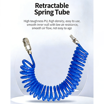 телескопическая пружинная трахея в костюме изготовлена из ПУ материала, на выбор доступны три цвета: черный, синий и красный. Внутренняя стенка из очень прочного полиуретана гладкая, что снижает сопротивление ветра и делает воздушный поток более плавным. В то же время полиуретановый материал обладает превосходной износостойкостью и устойчивостью к старению, а рабочее давление может достигать 1000 МПа, что может обеспечить сильный поток воздуха при удалении пыли, что делает работу по удалению пыли более эффективной. Быстроразъемные соединения на обоих концах трахеи также очень практичны. Вставная конструкция не требует инструментов, а соединение с пневматическим пистолетом и источником воздуха можно выполнить за несколько секунд, что значительно повышает эффективность работы.