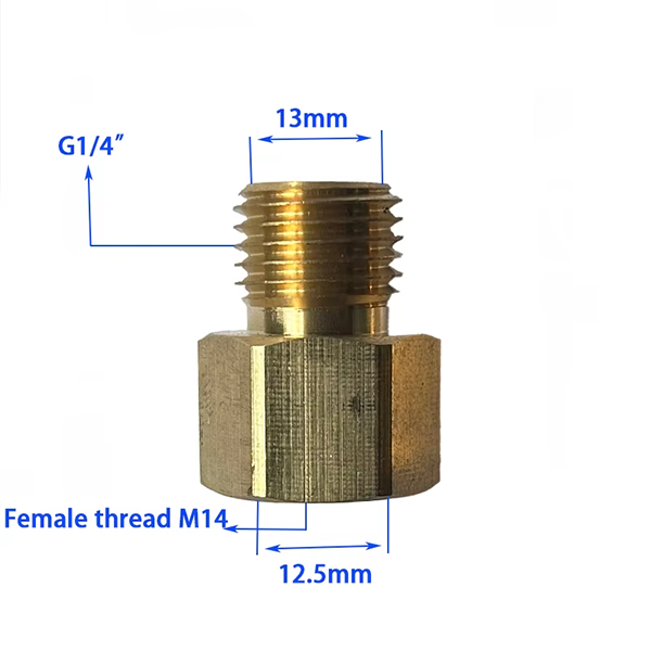 Размер самого продукта строго рассчитан в соответствии с соответствующим размером. На выбор есть две спецификации. Первый тип ниппеля: один конец имеет резьбу G1/4 дюйма диаметром 13 мм, а другой конец имеет внутреннюю резьбу M14×1,5 диаметром 12,5 мм. Второй тип ниппеля: один конец имеет наружную резьбу M14 диаметром 14 мм, а другой конец - внутреннюю резьбу M14×1,5 диаметром 12,5 мм и имеет внутренний конус. Конструкция внутреннего конуса может быть точно согласована с конической поверхностью соответствующего соединения, чтобы снова сформировать вторичное уплотнение, что позволяет значительно улучшить герметичность и устойчивость соединения к давлению. Латунный ниппель с внутренней резьбой от M14x1,5 до наружной резьбы M14 представляет собой латунный материал, обладающий сильной устойчивостью к коррозии и давлению. Транспортировка жидкостей требует длительной влажной среды и подвержена химическим реакциям. Таким образом, характеристики латунного материала позволяют сохранить его стабильность, его нелегко ржаветь и ломать, что влияет на весь рабочий процесс. Также это продлевает срок службы самого изделия и снижает затраты на замену оборудования.