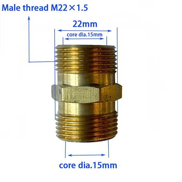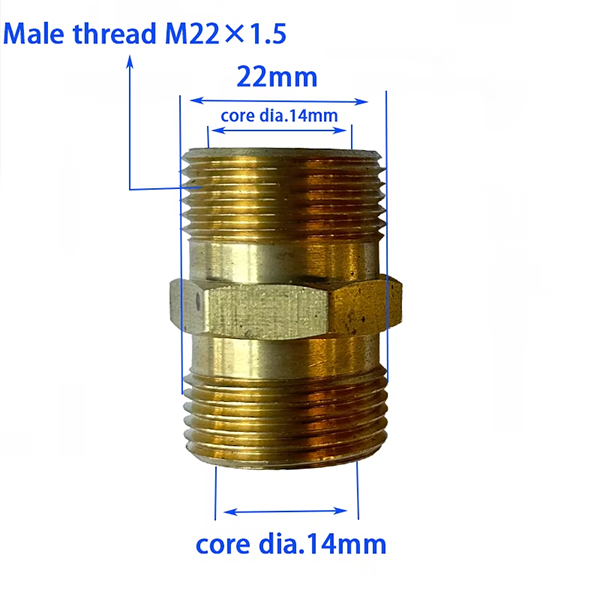 Размер этой латунной вилки M22 с отверстием 14/15 мм (опционально) очень строгий. Один конец изделия имеет наружную резьбу M22×1,5 диаметром 22 мм и имеет две спецификации. Диафрагму можно выбрать: одна с диаметром сердечника 14 мм, другая с диаметром сердечника 15 мм. Спецификация M22×1,5 является общим стандартом для многих видов оборудования, поэтому ее можно широко использовать со многими видами промышленного оборудования. Тип сердечника диаметром 14 мм подходит для моек высокого давления среднего давления, некоторых небольших гидравлических компонентов и т. д. Требования к потоку этого оборудования относительно умеренные, а диаметр отверстия соответствует требованиям. Тип сердечника диаметром 15 мм подходит для оборудования для очистки под высоким давлением большого объема или для крупномасштабных трубопроводов с механическими жидкостями. В этих областях существует потребность в передаче большого потока, поэтому апертура может удовлетворить потребности. Материал самого изделия – латунь. Выдающимся преимуществом латуни является устойчивость к коррозии. В рабочей среде изделия часто приходится в течение длительного времени сталкиваться с химическими средами, такими как вода, масло или моющие средства. Легко реагировать во влажной и сложной рабочей среде. Латунь может оставаться стабильной в этой среде в течение длительного времени, чтобы избежать коррозии и ржавчины. Риск утечки. В то же время латунь также обладает характеристиками высокой прочности, которая может выдерживать удары давлением во время передачи высокого напряжения, и ее нелегко сломать и расколоть при очистке под высоким давлением.