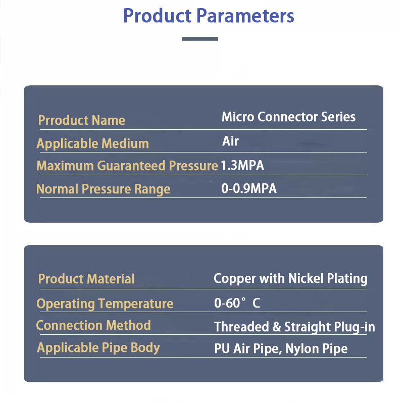 Диапазон допусков самой серии Micro Mini Connector находится в диапазоне температур 0–60°C. Кроме того, максимальное гарантированное давление может достигать 1,32 МПа, а нормальный диапазон рабочего давления составляет 0–0,9 МПа. Это в полной мере охватывает стабильную работу пневмоинструмента, автоматизированных цилиндров и другого оборудования, требующего условий работы под высоким давлением. Конструкция серии Micro Mini Connector может точно соответствовать потребностям промышленных операций и может быть адаптирована к трахеополиуретановым и нейлоновым трубкам, которые являются основными трубками на рынке. Конструкция этой серии продуктов обеспечивает превосходную герметизирующую функцию. Судя по общей конструкции изделия, соединительный материал корпуса клапана выполнен из никелированной меди. Никелированный медный материал обладает не только превосходной герметизацией медного материала, но и хорошей коррозионной стойкостью никелированного слоя, поэтому он может сохранять работу даже во влажной или пыльной среде в течение длительного времени. Стабильность работы не легко ржавеет, что влияет на стабильность соединения. Внутри используется специальное вогнутое уплотнительное кольцо с большей площадью контакта, что обеспечивает более высокую посадку и более прочное уплотнение. В то же время само изделие имеет стандартную резьбу R общей промышленной резьбы. В то же время сочетание стандартной резьбы R и внутренней стопорной пружины позволяет избежать износа и утечек, вызванных ослаблением деталей, что может обеспечить двойную защиту уплотняющих работ, что также означает, что срок службы продукта значительно продлевается. Наконец, резьба разъемов серии Micro Mini предварительно покрыта клеем из ПТФЭ. Сам материал тетрафторэтилена обладает очень хорошей химической стабильностью и определенной смазывающей способностью, что означает, что он может не только оптимизировать уплотняющий эффект резьбы, но и в определенной степени снизить его. Меньший износ резьбы продлит срок службы изделия. Серия разъемов Micro Mini, от материала до конструкции, призвана обеспечить хорошую герметизацию, чтобы в условиях работы пневматической системы под высоким давлением даже высокочастотная работа могла сохранять эффект герметизации «капельной защиты».