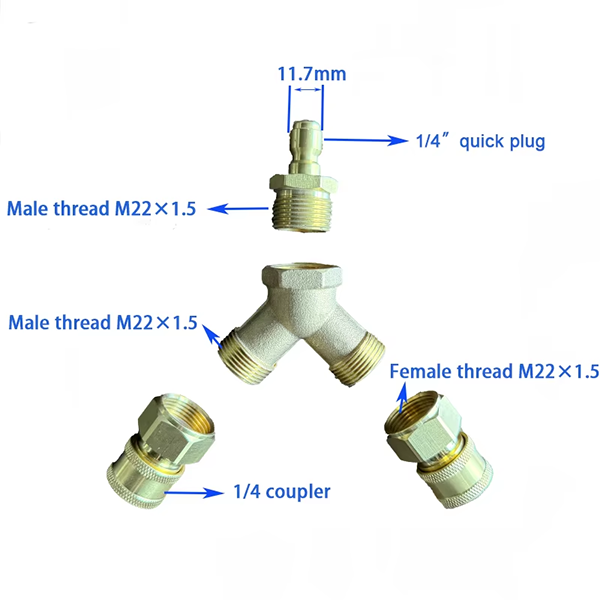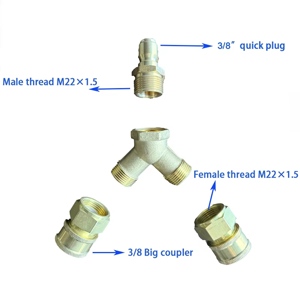 Полный медный разъем Джуинского трехстороннего движения в основном используется в области промывки автомобиля. Во время рабочего процесса он может реализовать одновременное водоснабжение нескольких оборудования, и в то же время его можно переключаться в любое время в соответствии с спросом, что очень удобно. , таким образом, значительно повышение эффективности очистки. Есть две модели Джуинского трехстороннего разъема. Первый-трехсторонний разъем с 1/4 "штекерной заглушкой и 2pcs 1/4". Один конец 1/4 дюйма имеет быструю конструкцию штекеры с диаметром 11,7 мм, а другой - мужская нить M22 × 1,5. Один конец двух 1/4 -дюймовых соединительных соединений - женская нить M22 × 1,5, а другой - 1/4 соединения. Размер 1/4 дюйма может быть гибко адаптирован к машинах для стирки автомобилей, распылительными пушками и другим оборудованием. Второй-трехсторонний разъем с 3/8 "штекерной заглушкой и 2pcs 3/8" соединителями. 3/8 ". Спецификация 3/8 дюймов может быть применена для использования более крупного потока, такого как очистка крупных транспортных средств или очистка промышленного оборудования, что значительно повышает эффективность очистки. Материал обеих моделей является полной меди, а медный материал обычно обладает хорошей коррозионной стойкостью. В сложной рабочей среде, такой как промывание автомобилей, можно поддерживать относительно стабильное соединение. В то же время медь также имеет определенную силу и твердость, и в то же время имеет отличную пластичность, является надежным выбором для среды очистки высокого давления.
