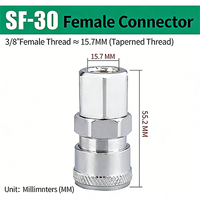 Быстроразъемные соединения C-типа серии PF–SF с резьбой JIS PT имеют конструкцию быстросъемного соединения C-типа. Мужскую и женскую головки можно сопоставить по желанию, их можно подключить и подключить, что очень удобно. В соединении применяется поверхностная гальваническая обработка с внутренним медным сердечником, который не только устойчив к коррозии, но и износостойкий, что повышает долговечность соединения и продлевает срок службы.