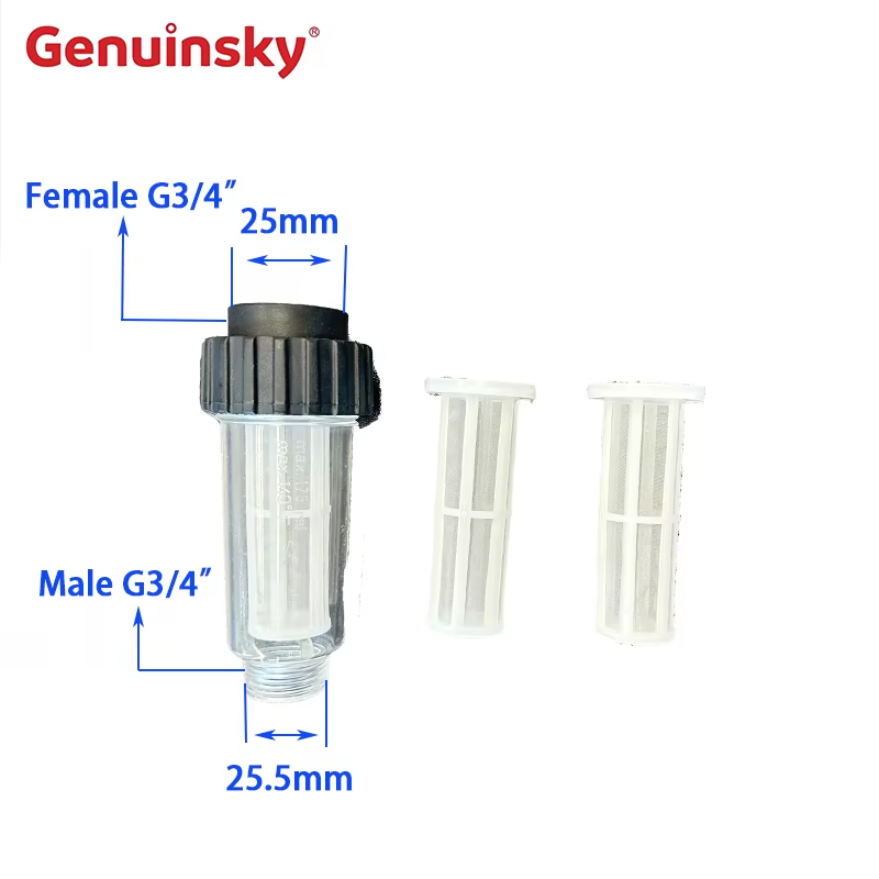 Этот водный фильтр для Karcher имеет две фильтрующую сетку. Один конец - самка G3/4 ", а диаметр - 25 мм. Другой конец - мужской G3/4", диаметр 25,5 мм. Ningbo Genuinsky Company - это компания, специализирующаяся на производстве аксессуаров для очистки автомобилей. Компания объединяет производство, разработку и продажи. Он имеет интимное обслуживание после продажи, отличное качество и преференциальную цену. За эти годы он достиг приятных транзакций со многими компаниями. Вы можете быть уверены, чтобы купить.